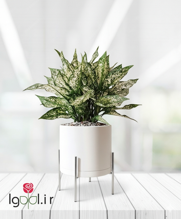 گیاه آگلونما برفی با گلدان پلیمری و پایه فلزی
