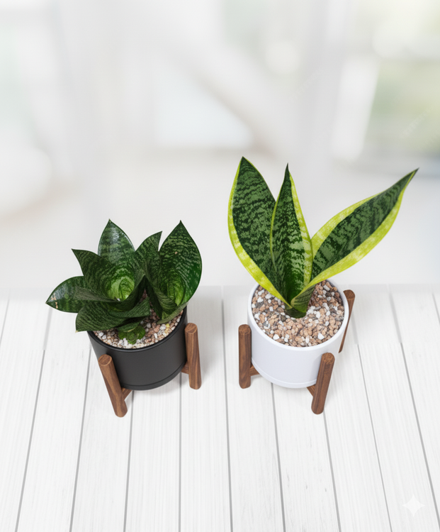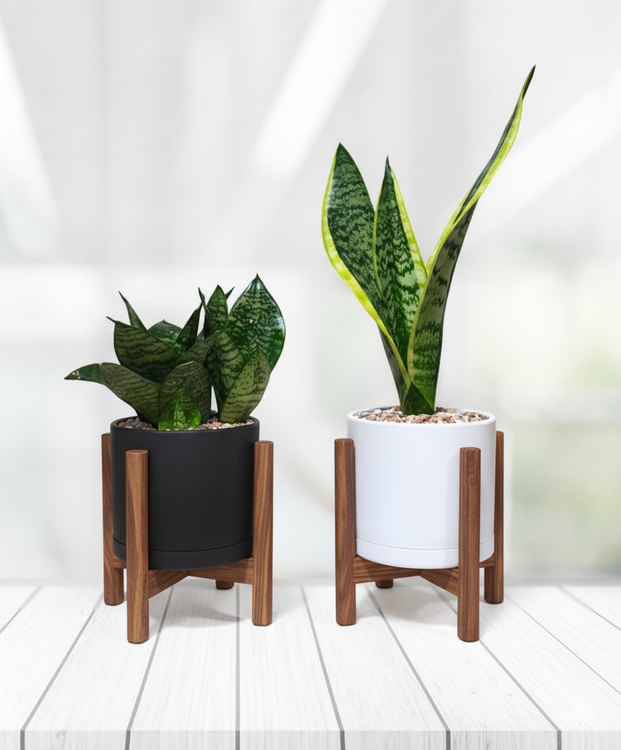 گیاه سانسوریا با گلدان پلیمری و پایه چوبی