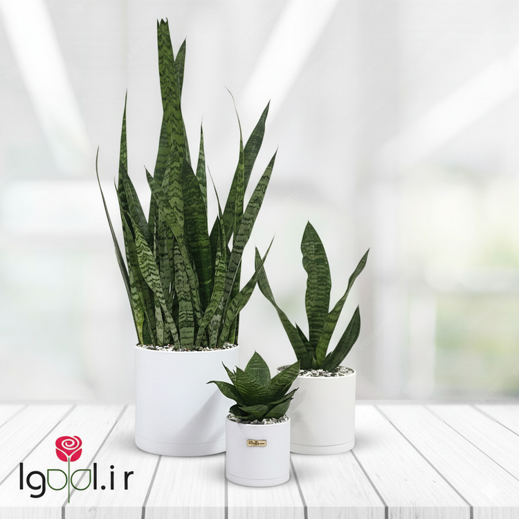 گیاه سانسوریا با گلدان پلیمری و پایه چوبی