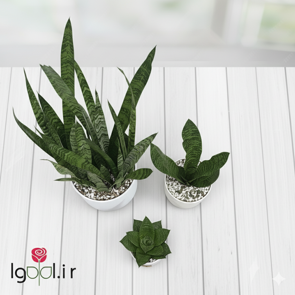 گیاه سانسوریا با گلدان پلیمری و پایه چوبی