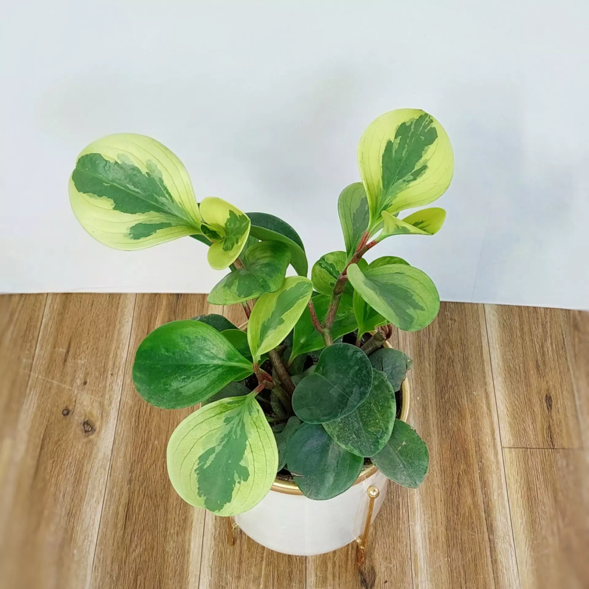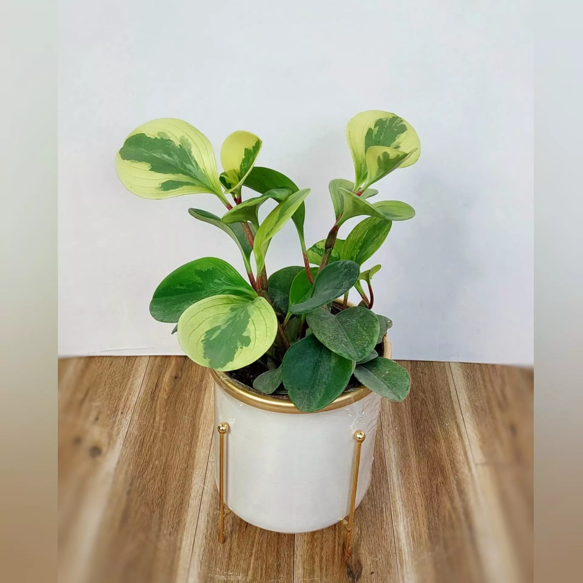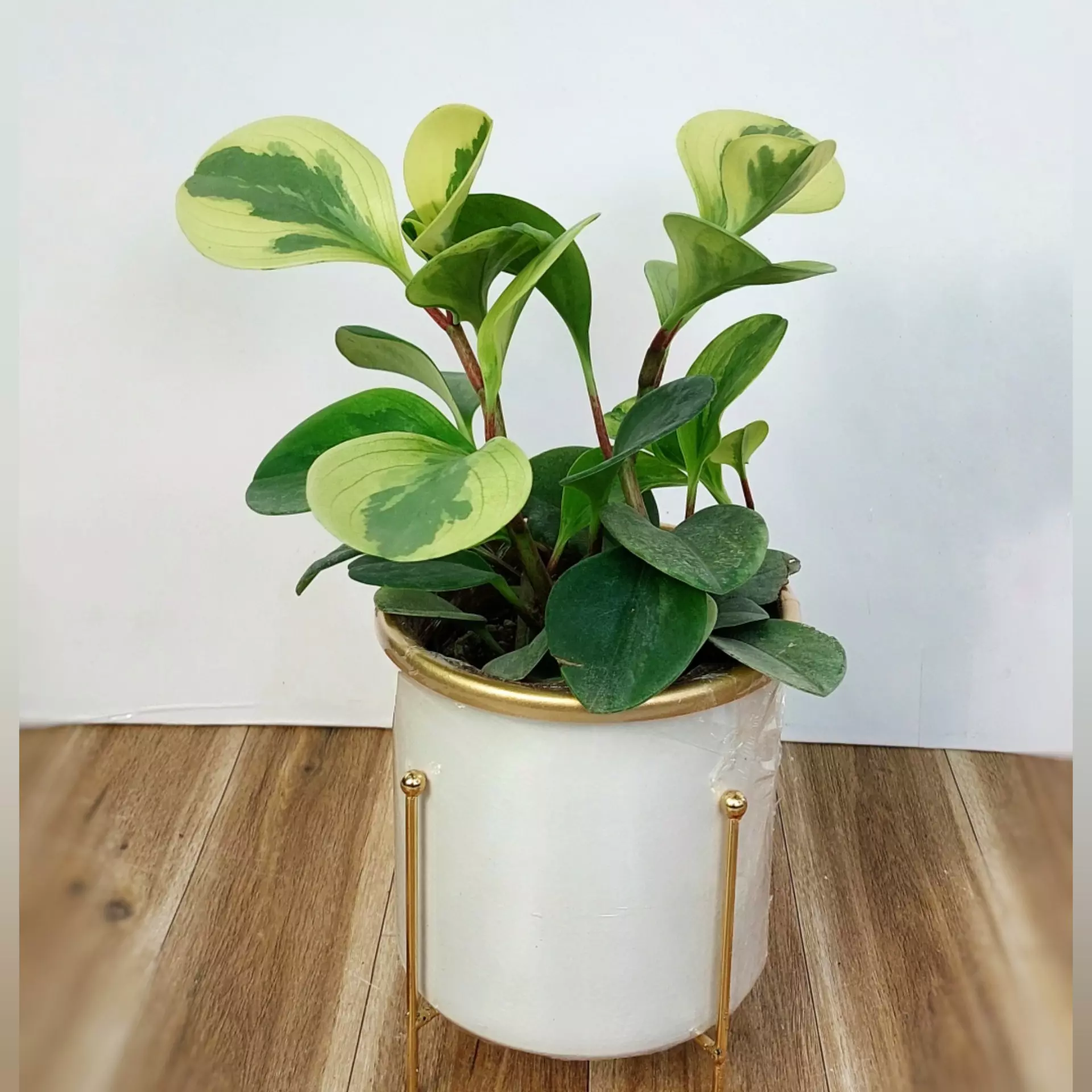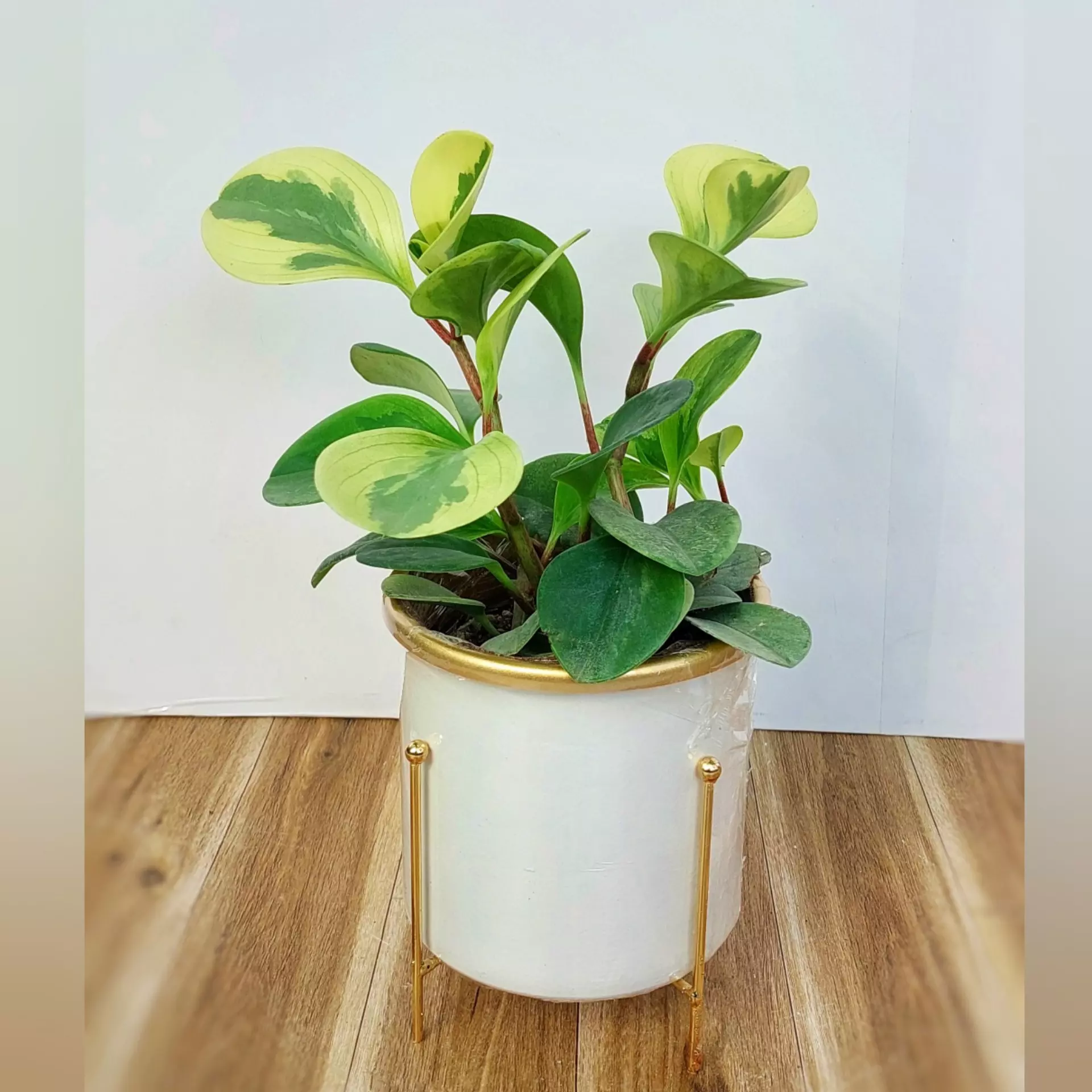 گیاه قاشقی ابلق به همراه گلدان فلزی پایه دار با قطر 13 سانتی متر