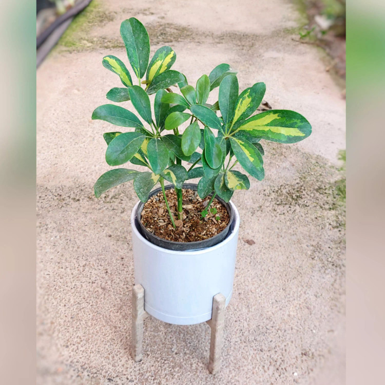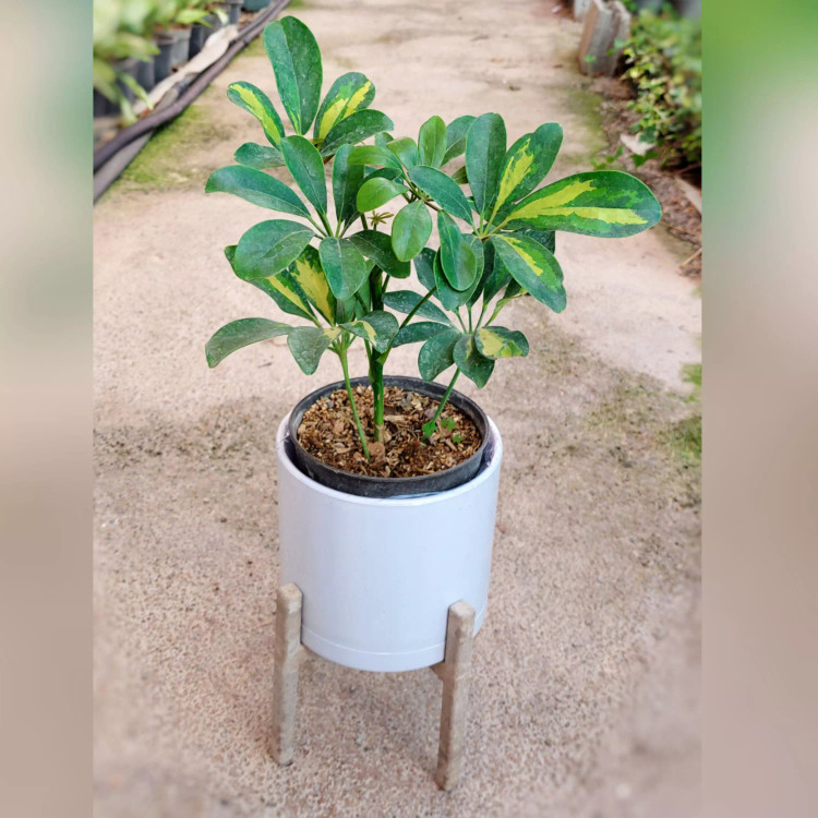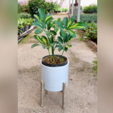 گیاه شفلرا ابلق به همراه گلدان پلیمری با پایه پلیمری و زیر گلدانی