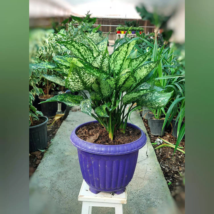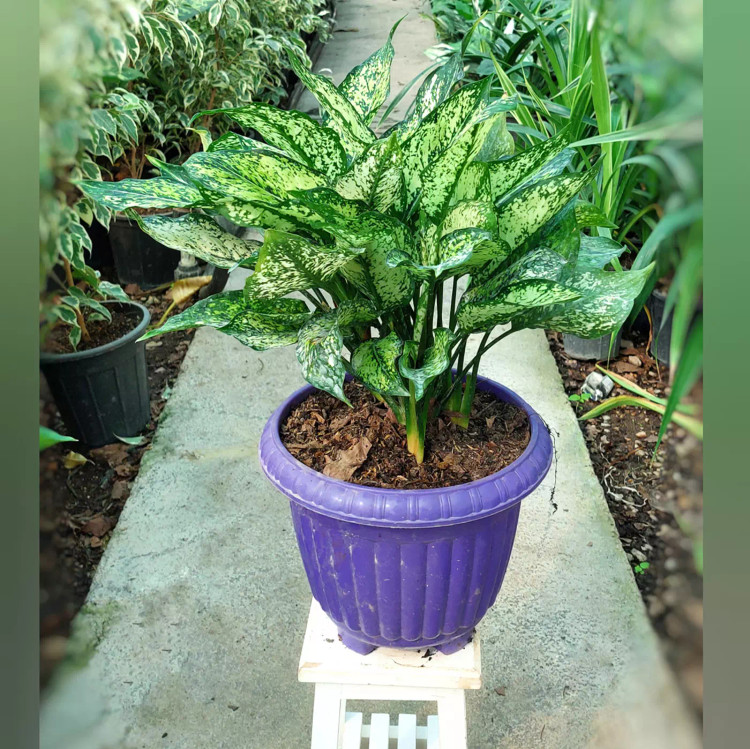 آگلونما سفید بسیار پر غلاف و زیبا همراه با گلدان پلاستیکی بنفش