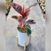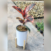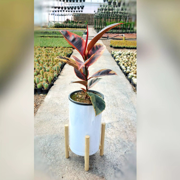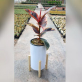 گیاه فیکوس شرابی به همراه گلدان پلیمری استوانه ای پایه دار چوبی و زیر گلدانی