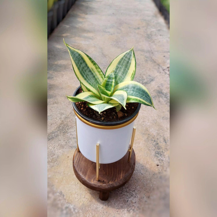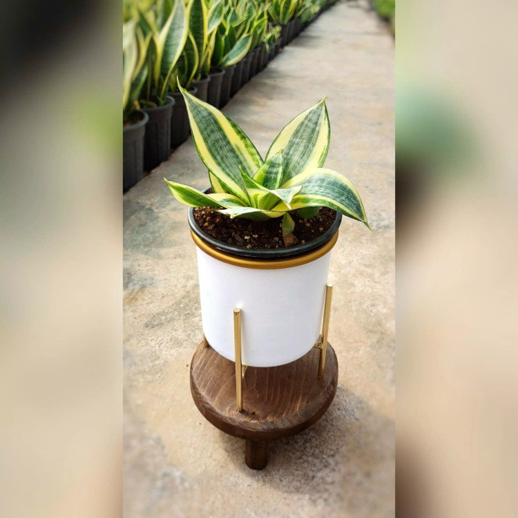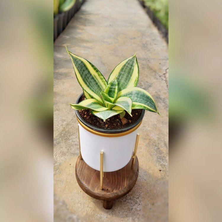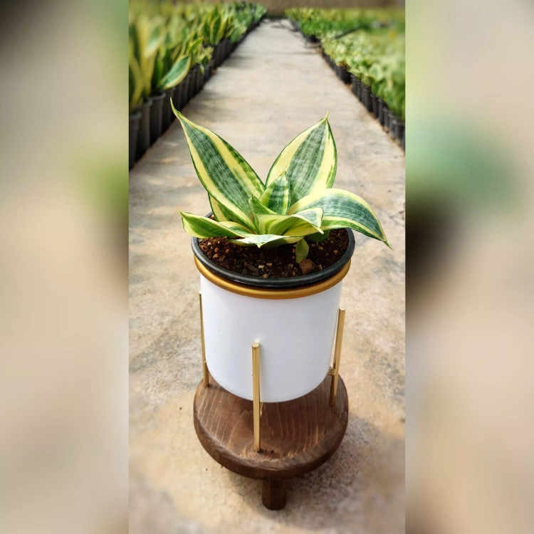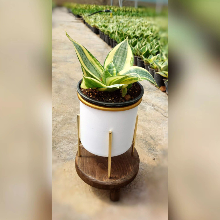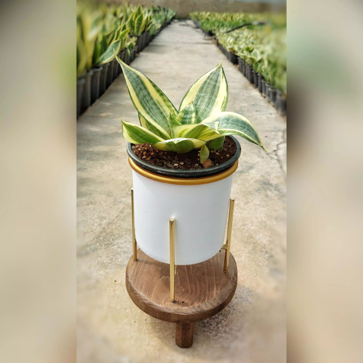 گیاه سانسوریا هانی گلد به همراه گلدان آلومینیومی نشکن و پایه گلدان فلزی